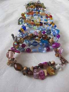 Adding beads, of course, was necessary because I changes each one into a double strand bracelet. I did enjoy making these, but I admit they were more work than I thought. Each bracelet takes roughly the length of time it takes for me to make a necklace, and I think probably more. It was tricky to get each strand to line up well, and trickier still to not allow much wire to show. I am happy with how they turned out. The bottom line for me is that I'd rather wear these than the bracelets they were originally. Let me know what you think of this style.